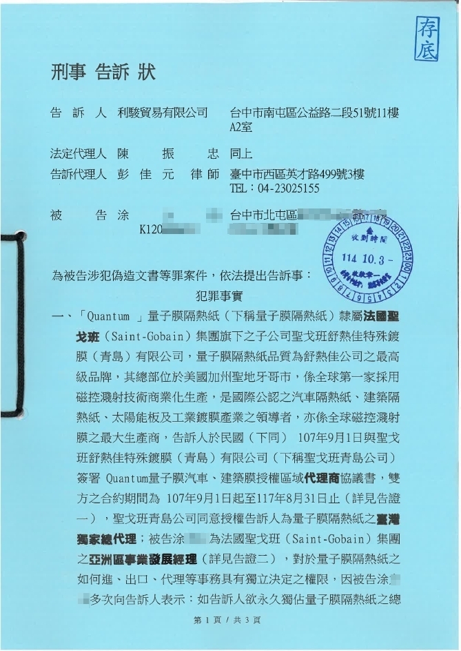 本公司已於民國114年10月3日依法向台中地檢署提出刑事告訴狀,針對涂** 涉嫌偽造文書等犯罪行為進行告訴。