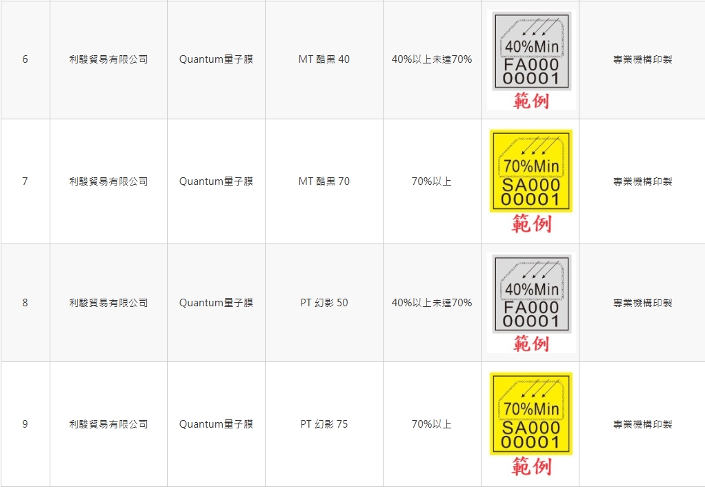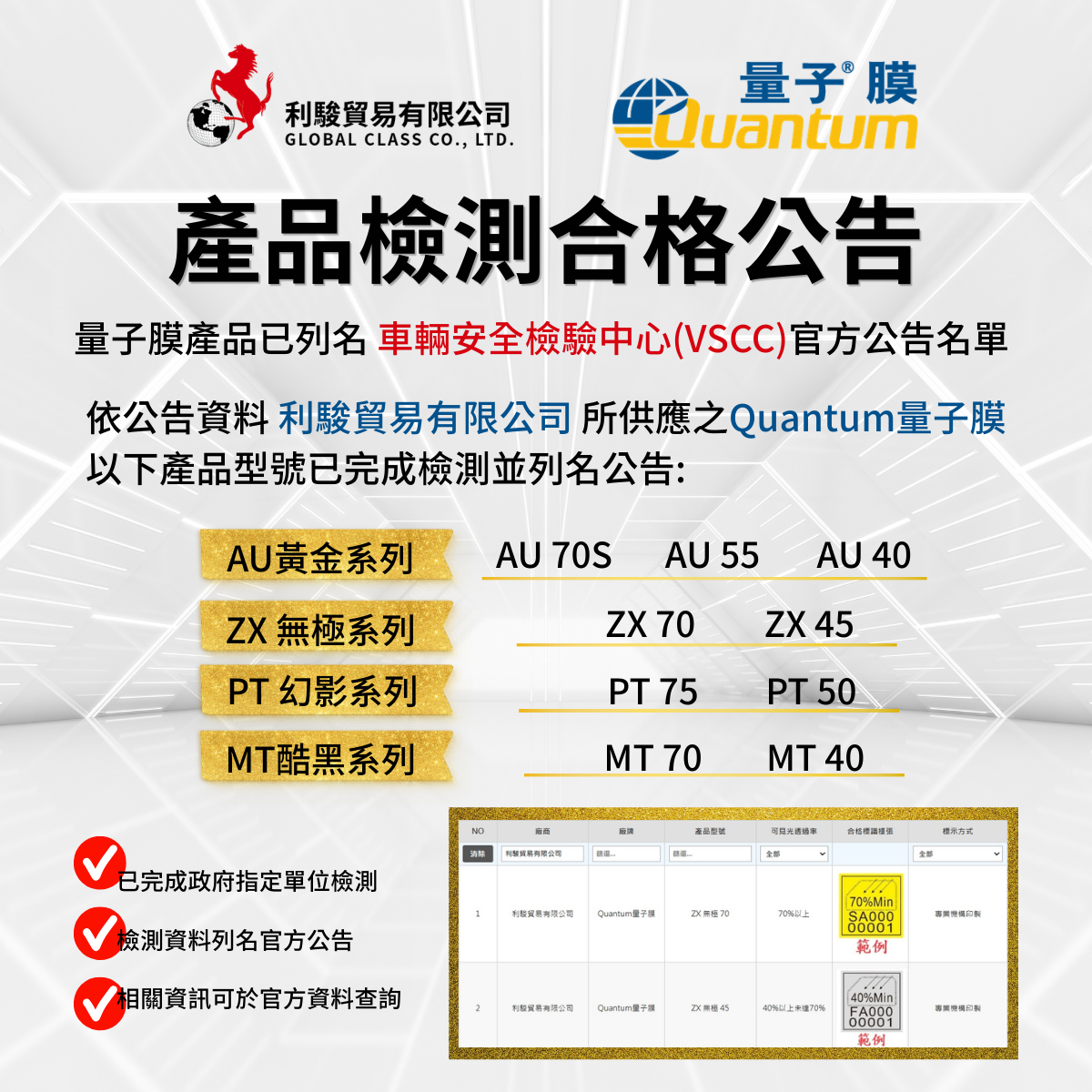 本公司所供應之 Quantum 量子膜相關產品,皆依規定完成政府第三方單位檢測程式,並已列名車輛安全審驗中心(VSCC) 官方公告名單中。